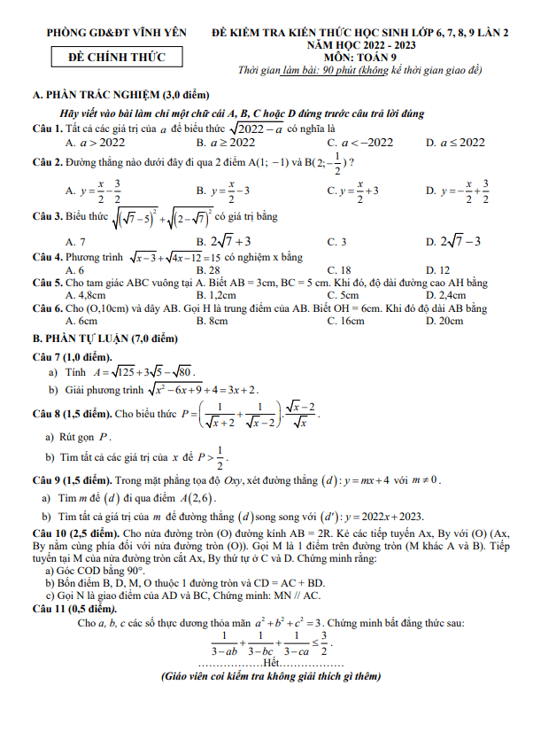 Đề kiểm tra Toán lớp 9 lần 2 năm 2022 – 2023 phòng GD&ĐT Vĩnh Yên – Vĩnh Phúc