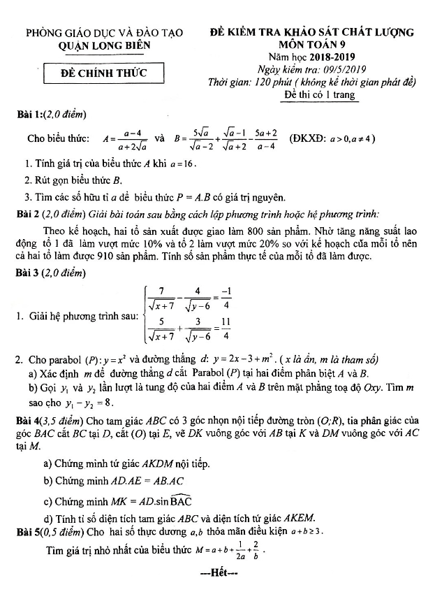 Đề kiểm tra lớp 9 môn Toán năm 2018-2019 phòng GD ĐT Long Biên Hà Nội