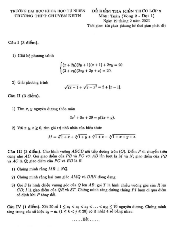 Đề kiểm tra lớp 9 môn Toán năm 2023 trường chuyên KHTN Hà Nội (Vòng 2 Đợt 1)