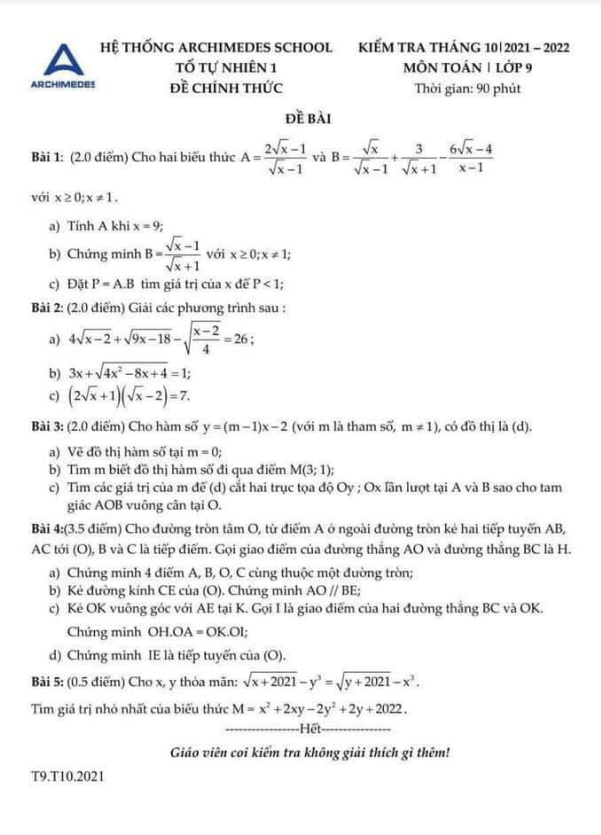 Đề thi kiểm tra Toán lớp 9 – Tháng 10 năm 2021 – THCS Archimedes Academy – Hà Nội