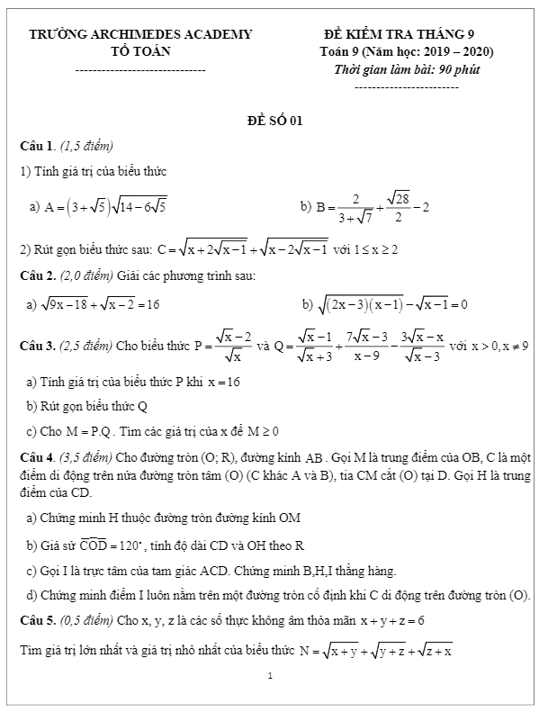 Đề kiểm tra lớp 9 môn Toán tháng 9 năm 2019 – 2020 trường Archimedes Academy Hà Nội
