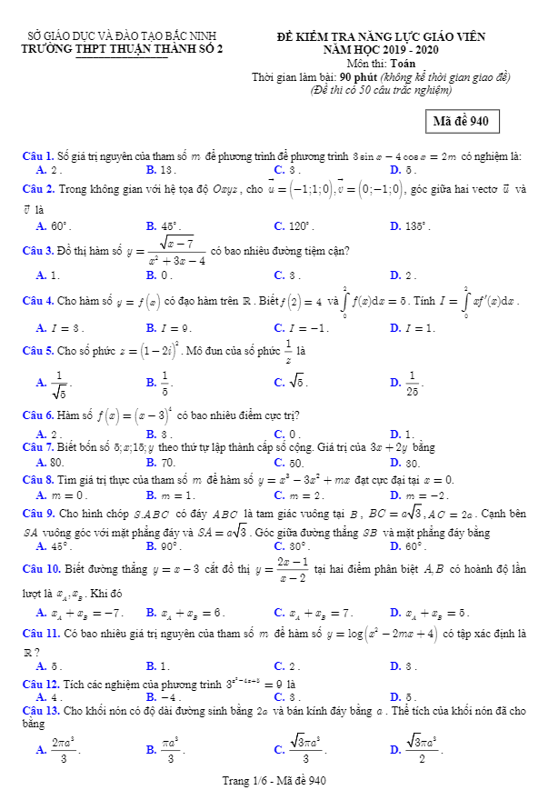 Đề kiểm tra năng lực giáo viên Toán năm học 2019 – 2020 trường THPT Thuận Thành số 2 – Bắc Ninh mã đề 940 được thiết kế với mục đích đánh giá khả năng chuyên môn của giáo viên bộ môn Toán. Đề bao gồm 06 trang với tổng cộng 50 câu trắc nghiệm, thời gian làm bài là 90 phút.