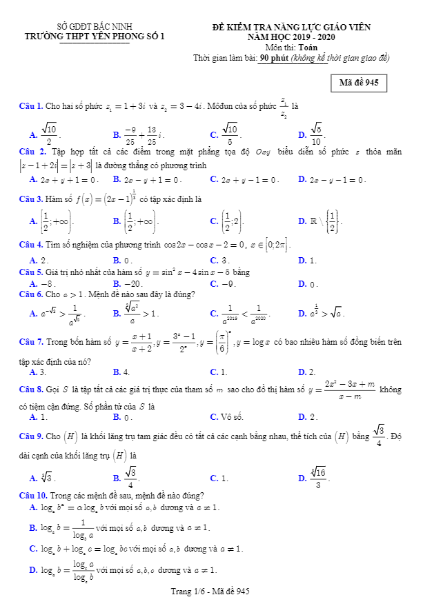 Đề kiểm tra năng lực giáo viên Toán năm 2019 – 2020 tại trường Yên Phong 1 – Bắc Ninh mang mã đề 945. Đề bao gồm 50 câu trắc nghiệm trên 06 trang, với thời gian làm bài là 90 phút. Cấu trúc của đề thi tương tự như đề thi Trung học Phổ thông Quốc gia môn Toán.