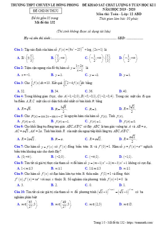 Ngày … tháng … năm 2019, trường THPT chuyên Lê Hồng Phong – Nam Định đã tổ chức kỳ thi khảo sát chất lượng môn Toán lớp 12 trong 8 tuần học đầu tiên của học kỳ 1 năm học 2019 – 2020. Đề KSCL 8 tuần HK1 Toán lớp 12 năm 2019 – 2020 của trường chuyên Lê Hồng Phong – Nam Định có mã đề 132, được thi cho các lớp 12 theo học các khối A, B, D. Đề bao gồm 50 câu trắc nghiệm trên 05 trang, học sinh có 90 phút để làm bài.Trích dẫn đề KSCL 8 tuần HK1 Toán lớp 12 năm 2019 – 2020 trường chuyên Lê Hồng Phong – Nam Định bao gồm các câu hỏi sau:1. Cho hình nón (N) có đỉnh S, tâm đường tròn đáy là O, góc ở đỉnh bằng 120 độ. Một mặt phẳng qua S cắt hình nón (N) theo thiết diện là tam giác vuông SAB. Biết khoảng cách giữa hai đường thẳng AB và SO bằng 3. Hãy tính diện tích xung quanh Sxq của hình nón (N).2. Trong các khối đa diện sau đây, khối nào có các mặt không phải là tam giác đều? A. Khối bát diện đều. B. Khối mười hai mặt đều. C. Khối tứ diện đều. D. Khối hai mươi mặt đều.3. Một ô tô đang chuyển động đều với vận tốc 12 (m/s), người lái đạp phanh khiến ô tô chuyển động chậm dần với vận tốc v(t) = -2t + 12 (m/s) (trong đó t là thời gian tính bằng giây, kể từ lúc đạp phanh). Tính quãng đường mà ô tô đi được trong 8 giây cuối trước khi dừng hoàn toàn.File WORD (dành cho quý thầy, cô) chứa toàn bộ nội dung cụ thể của đề thi và đáp án. Đề KSCL 8 tuần HK1 Toán lớp 12 năm 2019 – 2020 của trường chuyên Lê Hồng Phong – Nam Định giúp học sinh ôn tập và kiểm tra kiến thức sau 8 tuần học đầu tiên, để chuẩn bị tốt cho kỳ thi cuối kỳ 1.