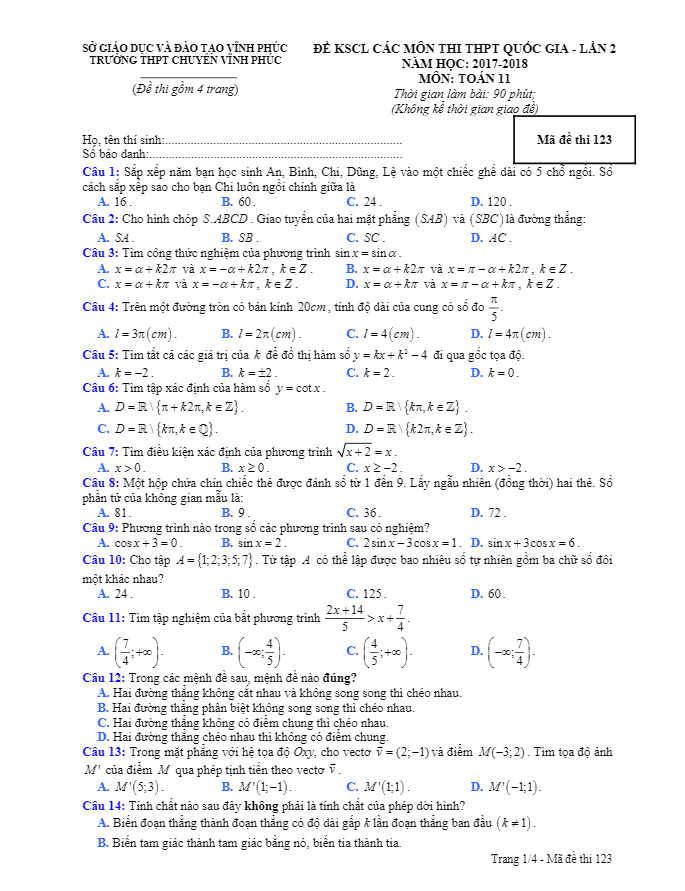 Đề KSCL môn Toán lớp 11 trường chuyên Vĩnh Phúc năm 2017 – 2018 là bài kiểm tra gồm 50 câu hỏi trắc nghiệm được thiết kế để ôn tập kiến thức Toán từ lớp 11. Thời gian làm bài cho học sinh là 90 phút.