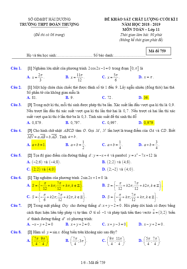 Đề KSCL cuối học kì 1 (HK1) lớp 11 môn Toán năm học 2018 2019 trường THPT Đoàn Thượng Hải Dương