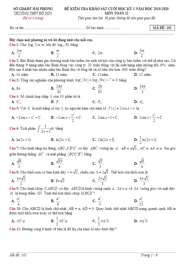 Đề KSCL cuối học kỳ 1 (HK1) môn Toán lớp 12 năm 2019 2020 trường THPT Đồ Sơn Hải Phòng