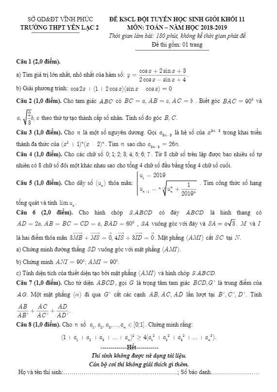 Đề KSCL đội tuyển HSG Toán lớp 11 năm 2018 – 2019 trường Yên Lạc 2 – Vĩnh Phúc