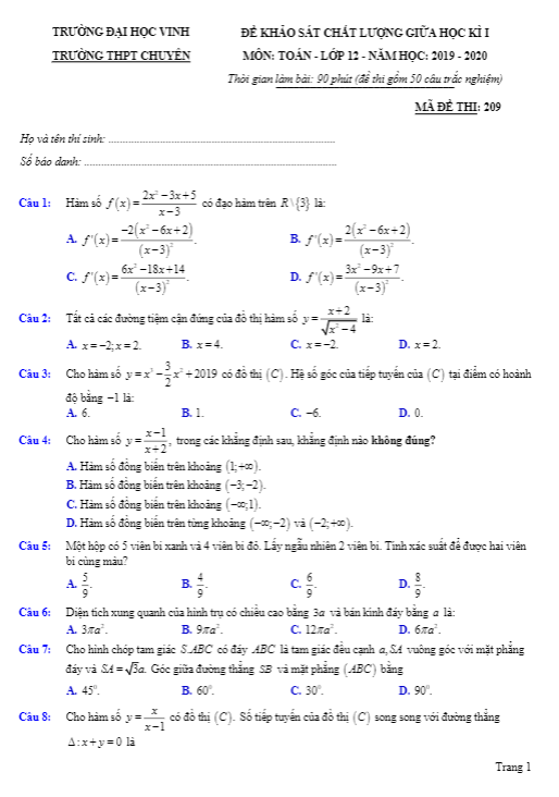 Ngày … tháng 11 năm 2019, trường THPT chuyên Đại học Vinh, tỉnh Nghệ An đã tổ chức kì thi khảo sát chất lượng giữa học kì 1 môn Toán lớp 12 năm học 2019 – 2020. Đề KSCL giữa kì 1 Toán lớp 12 năm 2019 – 2020 của trường chuyên ĐH Vinh – Nghệ An có mã đề 209. Bài thi gồm 50 câu trắc nghiệm, có thời gian làm bài 90 phút.