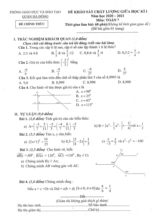 Ngày 05 tháng 11 năm 2020, phòng Giáo dục và Đào tạo quận Hà Đông, thành phố Hà Nội đã tổ chức kỳ thi khảo sát chất lượng giữa học kì 1 môn Toán lớp 7 năm học 2020 – 2021. Đề KSCL này gồm 01 trang với 04 câu trắc nghiệm (mỗi câu chiếm 1,0 điểm) và 04 câu tự luận (mỗi câu chiếm 9,0 điểm), thời gian làm bài thi là 60 phút.
