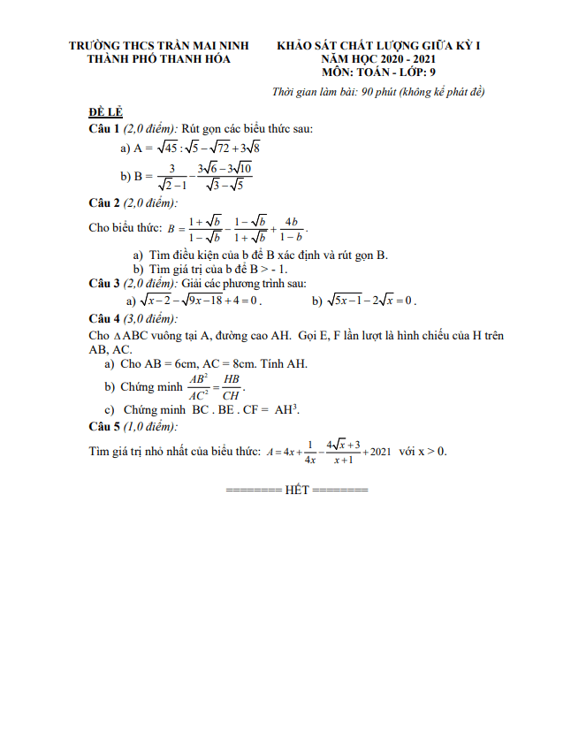 Đề KSCL giữa học kì 1 (HK1) lớp 9 môn Toán năm 2020 2021 trường THCS Trần Mai Ninh Thanh Hóa