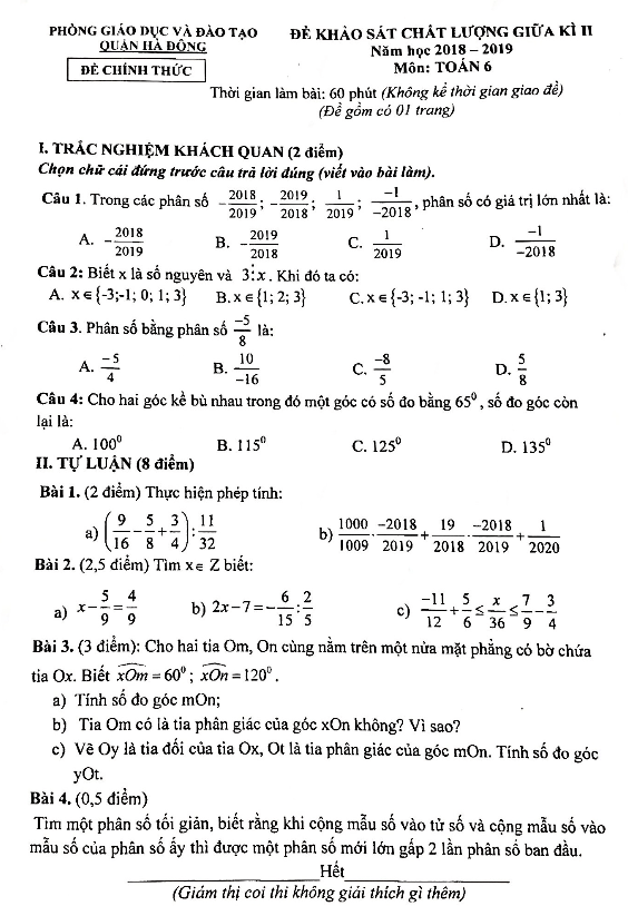 Vừa qua, phòng Giáo dục và Đào tạo quận Hà Đông, Hà Nội đã tổ chức kỳ thi khảo sát chất lượng giữa học kì 2 môn Toán dành cho học sinh khối lớp 6. Mục đích của kỳ thi là kiểm tra kiến thức Toán của học sinh lớp 6 từ đầu đến giữa học kì 2 năm học 2018 – 2019. Đề KSCL bao gồm 01 trang với 04 câu hỏi trắc nghiệm và 04 bài toán tự luận, thời gian làm bài 60 phút.