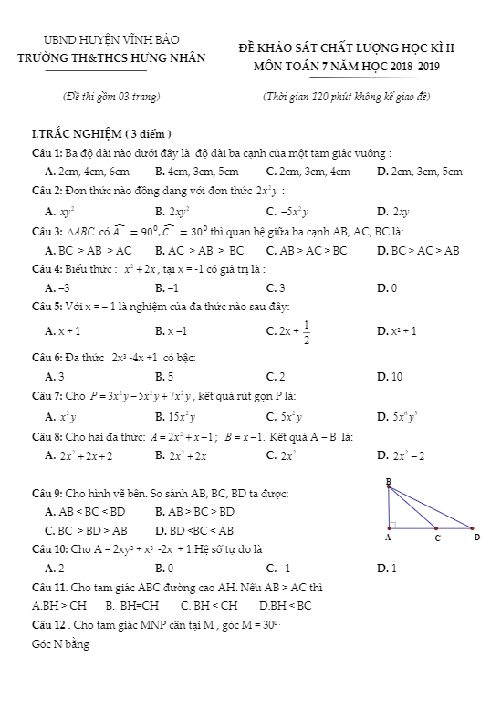 Đề KSCL học kì 2 Toán lớp 7 năm 2018 – 2019 trường Hưng Nhân Hải Phòng