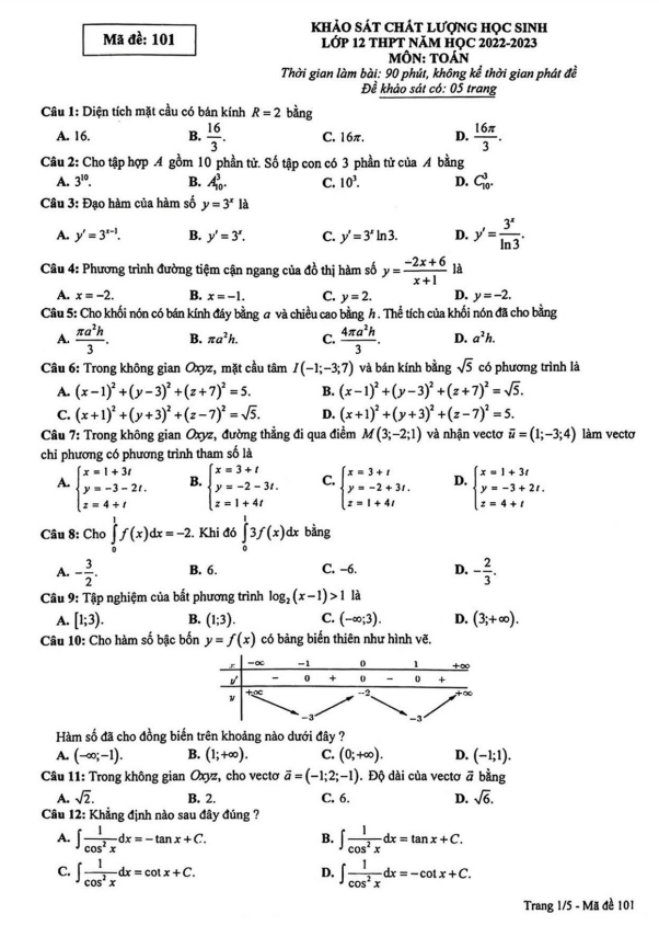 Để chuẩn bị cho kỳ thi tốt nghiệp THPT năm 2023, Sytu xin giới thiệu đến quý thầy cô và các em học sinh lớp 12 đề thi khảo sát chất lượng học sinh môn Toán lớp 12 lần 2 năm học 2022 – 2023 của sở Giáo dục và Đào tạo tỉnh Phú Thọ (mã đề 101). Kỳ thi sẽ diễn ra vào thứ Năm, ngày 27 tháng 04 năm 2023.