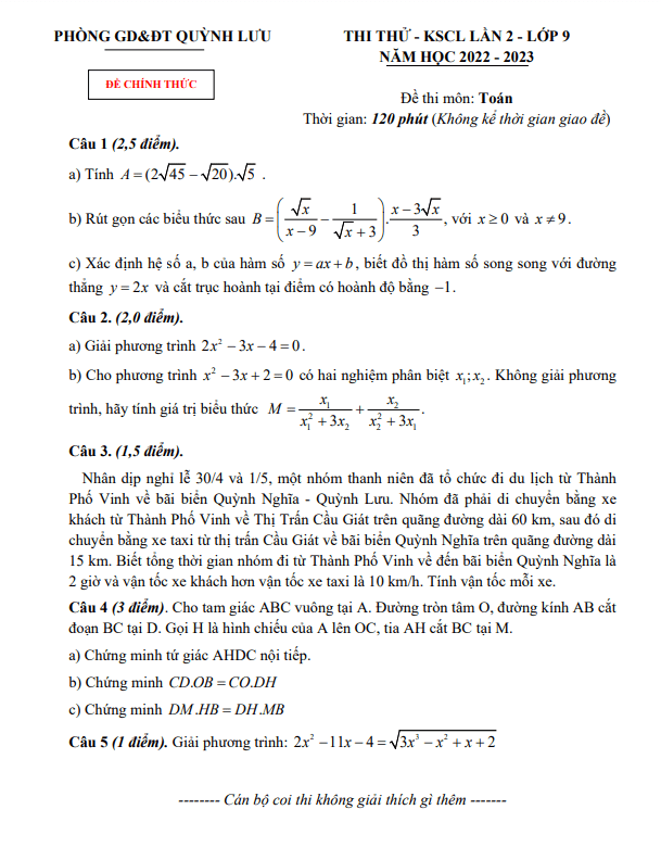 Đề KSCL lần 2 Toán lớp 9 năm 2022 – 2023