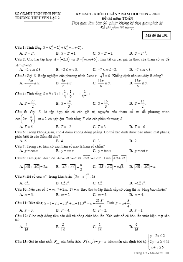 Trong kỳ thi khảo sát chất lượng Toán lớp 11 tại trường THPT Yên Lạc 2 – Vĩnh Phúc, đề KSCL lần 2 năm học 2019 – 2020 được tổ chức nhằm kiểm tra và đánh giá chất lượng dạy và học trong giai đoạn giữa học kỳ 2. Đề thi được mã hóa là 101 và bao gồm 50 câu trắc nghiệm trên 5 trang giấy. Thời gian làm bài là 90 phút và đề thi đi kèm với đáp án chi tiết.