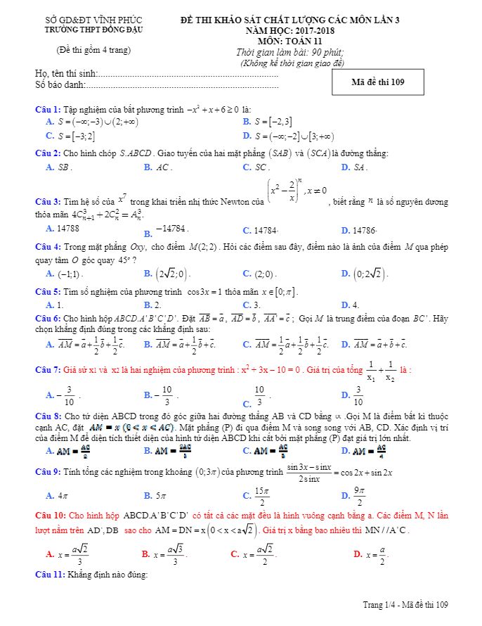 Đề KSCL Toán lớp 11 năm học 2017 – 2018 trường THPT Đồng Đậu – Vĩnh Phúc lần 3 là một bộ đề khảo sát chất lượng toán học của học sinh lớp 11 tại trường THPT Đồng Đậu. Đề gồm 50 câu hỏi trắc nghiệm được chia thành 4 trang, thời gian làm bài là 90 phút. Mỗi câu hỏi được thiết kế để kiểm tra kiến thức và kỹ năng toán học của học sinh trong môn Toán.Một trong những câu hỏi trong đề KSCL Toán lớp 11 năm học 2017 – 2018 là về tứ diện ABCD, trong đó đường thẳng AB và CD là song song và góc giữa chúng bằng nhau. Điểm M thuộc cạnh AC sao cho AM = x, và mặt phẳng (P) đi qua M và song song với AB và CD. Học sinh cần xác định vị trí của điểm M để diện tích thiết diện của tứ diện ABCD khi cắt bởi mặt phẳng (P) đạt giá trị lớn nhất.Câu hỏi khác đề cập đến tứ diện ABCD, với G và E lần lượt là trọng tâm của tam giác ABD và tam giác ABC. Học sinh cần xác định mệnh đề đúng trong số các mệnh đề cho trước.Một câu hỏi khác về tính chất của phép dời hình, học sinh cần nhận biết tính chất không phải của phép dời hình để chọn đáp án đúng.Đề KSCL Toán lớp 11 năm học 2017 – 2018 trường THPT Đồng Đậu – Vĩnh Phúc lần 3 là cơ hội để học sinh thử thách và củng cố kiến thức, kỹ năng toán học của mình. Việc ôn tập và giải các câu hỏi trong đề này sẽ giúp học sinh nắm vững kiến thức và chuẩn bị tốt cho kỳ thi sắp tới.
