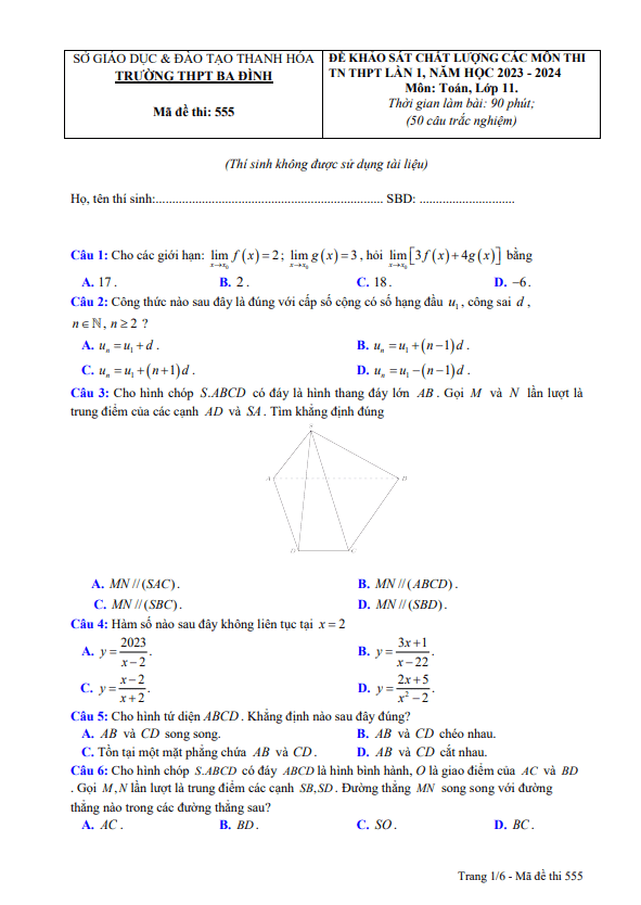 Chia sẻ Đề KSCL lớp 11 môn Toán thi TN THPT 2024 lần 1 trường THPT Ba Đình Thanh Hóa