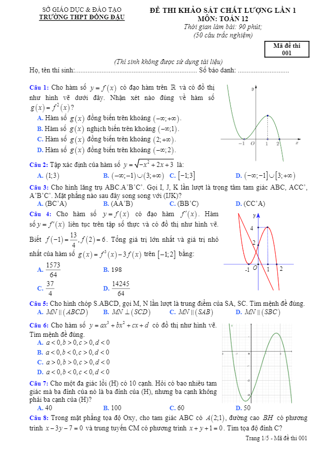 Đề KSCL Toán lớp 12 lần 1 năm 2018 – 2019 của trường THPT Đồng Đậu Vĩnh Phúc là một bộ đề thi được biên soạn theo hình thức trắc nghiệm khách quan. Đề thi gồm có 6 trang với tổng cộng 50 câu hỏi và bài toán. Học sinh cần hoàn thành bài thi trong thời gian 90 phút.