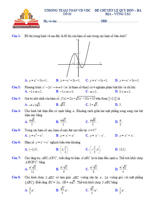 Trích đề KSCL Toán lớp 12 lần 1 tại trường THPT chuyên Lê Quý Đôn – Bà Rịa – Vũng Tàu: