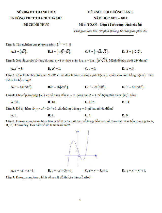 Xin chào quý thầy cô và các em học sinh lớp 12! Đây là đề khảo sát chất lượng bồi dưỡng môn Toán lớp 12 lần 1 năm học 2020-2021 của trường THPT Thạch Thành 1, tỉnh Thanh Hóa. Đề thi này bao gồm đáp án và lời giải chi tiết để giúp các em tự kiểm tra và cải thiện kiến thức của mình.
