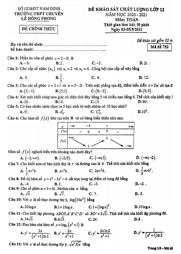 Vào sáng thứ Hai ngày 03 tháng 05 năm 2021, học sinh lớp 12 trường chuyên Lê Hồng Phong, Nam Định đã tham gia kỳ thi khảo sát chất lượng môn Toán cho năm học 2020 – 2021. Đề KSCL Toán lớp 12 năm 2020 – 2021 của trường này mang mã đề 752, bao gồm 50 câu hỏi trắc nghiệm trải dài trên 05 trang giấy, với thời gian làm bài là 90 phút.