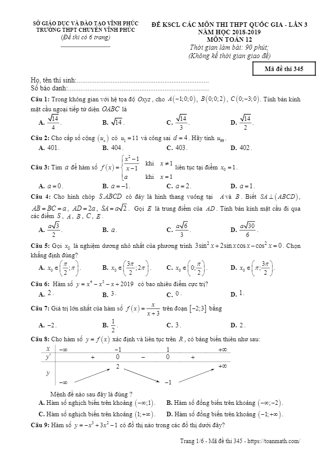 Đề KSCL Toán lớp 12 trường chuyên Vĩnh Phúc lần 3 năm học 2018-2019 đã được tổ chức thành công, nhằm giúp học sinh rèn luyện và nâng cao kiến thức trước kỳ thi chính thức THPT Quốc gia. Đề thi này bao gồm 50 câu trắc nghiệm khách quan, thời gian làm bài là 90 phút, đề thi cũng kèm theo đáp án và lời giải chi tiết.Một số câu hỏi trong đề KSCL lần này gồm:1. Xác định góc giữa hai đường thẳng AB và đáy hình trụ để thể tích khối tứ diện đạt giá trị lớn nhất.2. Tìm giá trị nhỏ nhất của bán kính mặt cầu ngoại tiếp tứ diện O.ABC trong không gian Oxyz.3. Đưa ra một mệnh đề về hàm số y = f(x) có đạo hàm trên R và đồ thị hàm số y = f'(x), yêu cầu đúng hay không.Đây là một cơ hội tuyệt vời cho học sinh khối 12 có thể thực hành, tự kiểm tra và đánh giá kỹ năng Toán của mình trước khi bước vào kỳ thi quan trọng. Đề thi được thiết kế theo cấu trúc của Bộ Giáo dục và Đào tạo, giúp học sinh làm quen với định dạng và cấu trúc đề thi sắp tới. Chúc các em học sinh thành công trong kỳ thi sắp tới!
