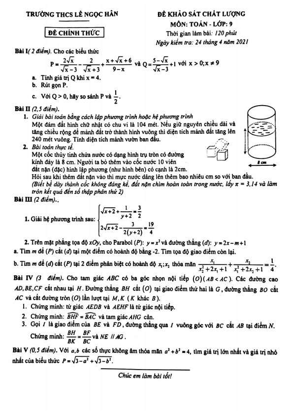 Ngày 24 tháng 04 năm 2021, học sinh trường THCS Lê Ngọc Hân đã trải qua kỳ thi khảo sát chất lượng môn Toán lớp 9. Đề thi gồm 5 bài toán dạng tự luận, với thời gian làm bài là 90 phút. Đề bài không chỉ đơn thuần là những câu hỏi toán học mà còn thách thức tư duy sáng tạo của các em.