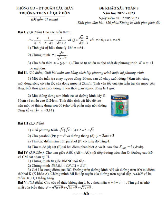 Xin chào quý thầy, cô giáo và các em học sinh lớp 9! Hôm nay, Sytu xin giới thiệu đến bạn đề thi khảo sát chất lượng môn Toán lớp 9 năm học 2022-2023 tại trường THCS Lê Quý Đôn, quận Cầu Giấy, thành phố Hà Nội. Kỳ thi sẽ diễn ra vào ngày 27 tháng 05 năm 2023. Đề thi bao gồm đáp án và hướng dẫn chấm điểm.
