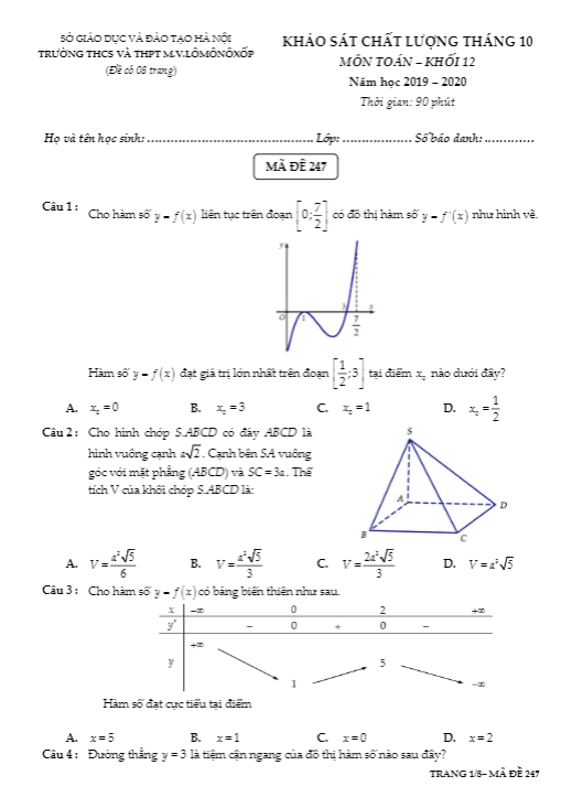 Trường THCS và THPT M.V Lômônôxốp – Hà Nội tổ chức kỳ thi khảo sát chất lượng tháng 10 môn Toán lớp 12 nhằm đánh giá kiến thức và chuẩn bị cho kỳ thi THPT Quốc gia 2020. Đề thi có mã đề 247, bao gồm 50 câu trắc nghiệm trong thời gian 90 phút.