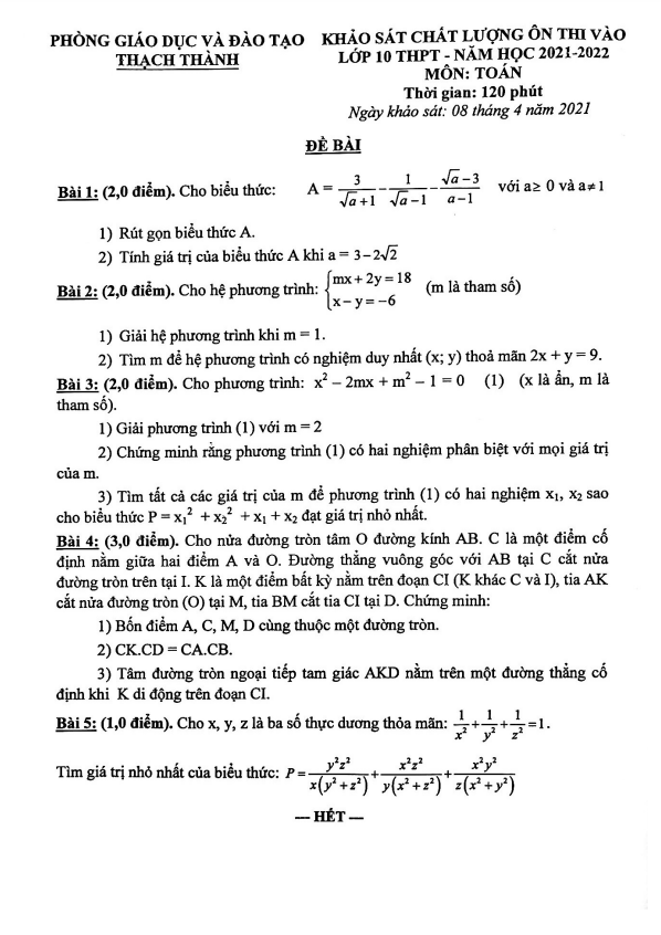 Vào Thứ Năm ngày 08 tháng 04 năm 2021, phòng Giáo dục và Đào tạo huyện Thạch Thành, tỉnh Thanh Hóa đã tổ chức kỳ thi khảo sát chất lượng môn Toán ôn thi vào lớp 10 THPT cho năm học 2021 – 2022. Đề thi bao gồm 01 trang với 05 bài toán dạng tự luận, thời gian làm bài là 120 phút.