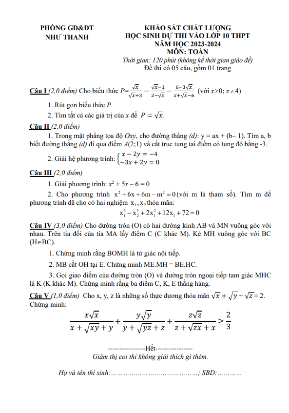 Đề KSCL Toán vào năm 2023 2024 phòng GD ĐT Như Thanh Thanh Hoá