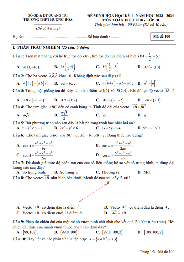 Sytu xin gửi đến quý thầy cô và các em học sinh lớp 10 đề minh họa kiểm tra cuối học kỳ 1 môn Toán lớp 10 năm học 2023 – 2024 trường THPT Hướng Hóa, tỉnh Quảng Trị.