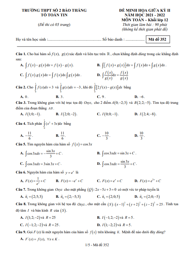 Đề minh họa giữa học kì 2 (HK2) lớp 12 môn Toán năm 2021 2022 trường THPT Bảo Thắng 2 Lào Cai