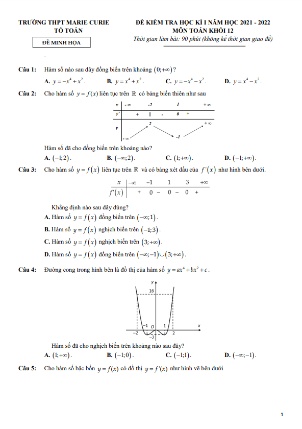 Đề minh họa học kì 1 Toán lớp 12 năm học 2021-2022 tại trường THPT Marie Curie TP HCM không chỉ đánh giá kiến thức mà còn khuyến khích học sinh phải tư duy logic, sáng tạo trong việc giải quyết các bài toán phức tạp.