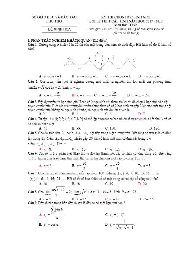 Đề minh họa kỳ thi chọn HSG (học sinh giỏi) Toán lớp 12 THPT cấp tỉnh năm học 2017 – 2018 sở GD và ĐT Phú Thọ bao gồm 6 trang với tổng cộng 40 câu hỏi trắc nghiệm (đã có đáp án) và 4 bài toán tự luận (có đáp số). Thời gian làm bài cho các thí sinh là 180 phút.