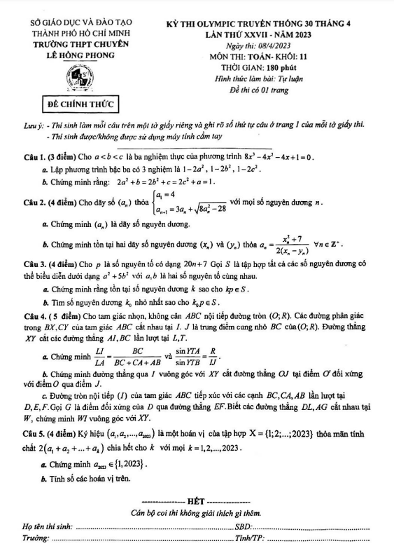 Đề Olympic 30/04 Toán lớp 11 năm 2023 trường chuyên Lê Hồng Phong TP HCM