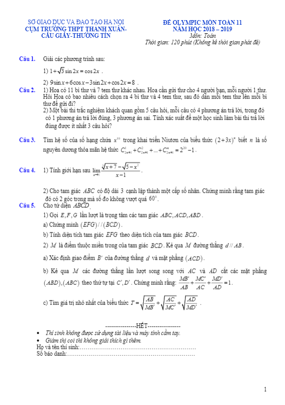 Đề Olympic Toán lớp 11 năm 2019 cụm THPT Thanh Xuân & Cầu Giấy & Thường Tín – Hà Nội là cơ hội để học sinh thể hiện kiến thức và khả năng giải quyết vấn đề trong môn Toán, đồng thời trao đổi kinh nghiệm và học hỏi từ nhau.