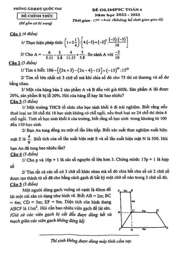 Đề Olympic lớp 6 môn Toán năm 2022 2023 phòng GD ĐT Quốc Oai Hà Nội