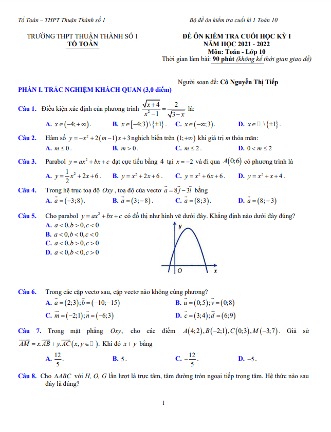 Đề ôn tập cuối học kì 1 môn Toán lớp 10 năm 2021 2022 trường Thuận Thành 1 Bắc Ninh
