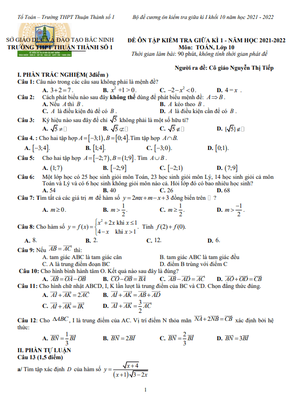 Đề ôn tập giữa kì 1 Toán lớp 10 năm 2021 – 2022 trường Thuận Thành 1 Bắc Ninh