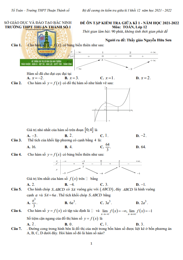 Đề ôn tập Toán lớp 12 giữa học kì 1 năm 2021-2022 trường Thuận Thành 1 Bắc Ninh