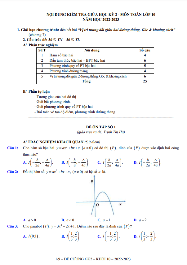 1. Hàm số bậc hai: 4 câu.