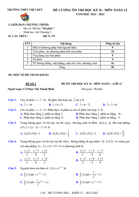 Đề ôn tập học kì 2 (HK2) lớp 12 môn Toán năm 2022-2023 trường THPT Việt Đức Hà Nội