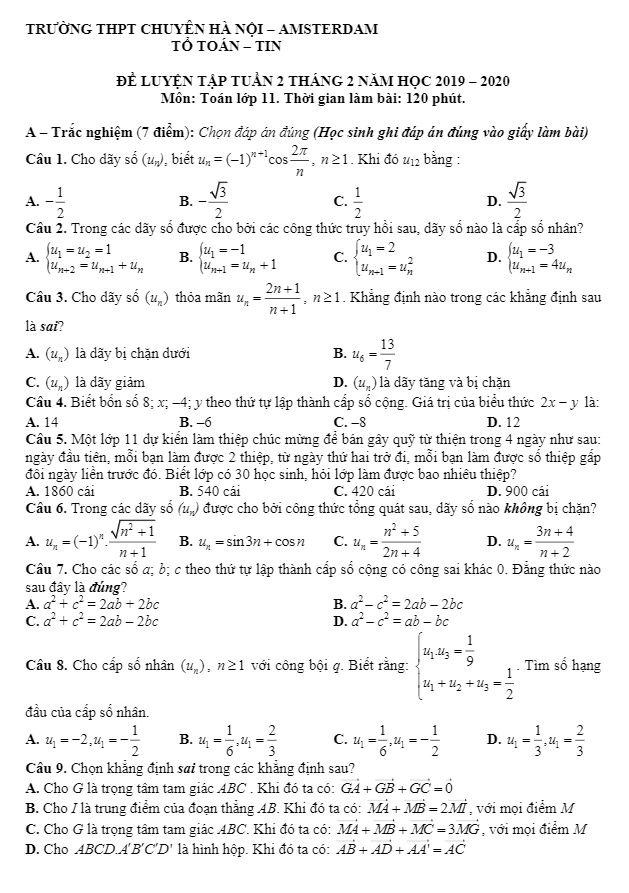 Đề ôn tập lớp 11 môn Toán tháng 02/2020 trường THPT chuyên Hà Nội – Amsterdam