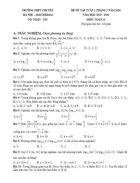 Đề ôn tập lớp 12 môn Toán tháng 03 năm 2020 trường THPT chuyên Hà Nội – Amsterdam