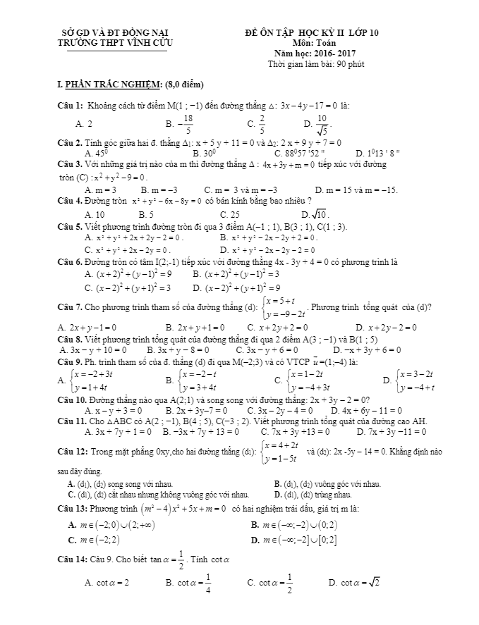 Đề ôn tập thi HK2 Toán lớp 10 năm học 2016 – 2017 trường THPT Vĩnh Cửu Đồng Nai
