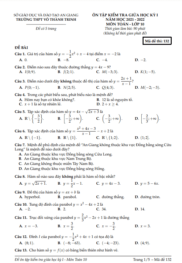 Đề ôn thi giữa kỳ 1 Toán lớp 10 năm 2021 – 2022 trường THPT Võ Thành Trinh – An Giang mã đề 132 bao gồm 05 trang với tổng cộng 50 câu trắc nghiệm, thời gian làm bài 90 phút.