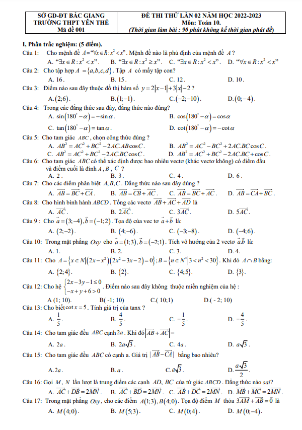 Bộ đề rèn kỹ năng làm bài lớp 10 môn Toán lần 2 năm 2022-2023 của trường THPT Yên Thế, Bắc Giang sẽ là công cụ hữu ích để các em học sinh tự học và tự kiểm tra kiến thức của mình. Đề thi bao gồm 25 câu trắc nghiệm và 05 câu tự luận, được thiết kế để kiểm tra năng lực và cải thiện kỹ năng làm bài của học sinh. Thời gian làm bài 90 phút là đủ để học sinh làm quen với cấu trúc đề thi và làm quen với việc làm bài trong thời gian có hạn.Trong đề thi, các câu hỏi được xây dựng có tính logic và yêu cầu học sinh phải tư duy và suy luận để giải quyết. Ví dụ như câu hỏi về khoảng cách giữa hai điểm A và B thông qua một điểm trung gian C, hoặc câu hỏi về số lượng vectơ có thể xác định được trong tam giác ABC. Những câu hỏi như vậy sẽ giúp học sinh rèn luyện kỹ năng tư duy logic và tăng cường kiến thức về môn Toán.Ngoài ra, đề thi còn đi kèm với đáp án chi tiết và hướng dẫn giải mã, giúp học sinh tự kiểm tra và tự sửa lỗi sau khi làm bài. Điều này sẽ giúp học sinh hiểu rõ hơn về những khái niệm và phương pháp giải bài tập, từ đó cải thiện kỹ năng và nâng cao thành tích học tập của mình.Với bộ đề rèn kỹ năng này, hy vọng rằng các em học sinh sẽ có thêm nguồn tài liệu hữu ích để chuẩn bị cho kỳ thi quan trọng của mình. Chúc các em học sinh thành công và đạt kết quả cao trong môn Toán.