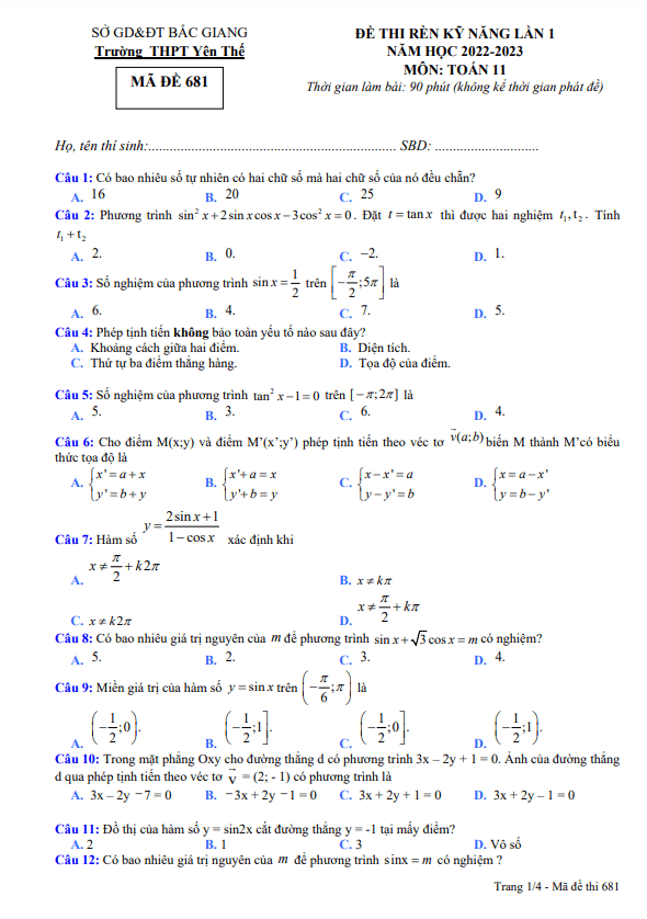 Sytu xin kính chào quý thầy cô và các em học sinh lớp 11. Hôm nay chúng ta sẽ cùng tìm hiểu về đề thi rèn luyện kỹ năng làm bài môn Toán lớp 11 lần 1 năm học 2022-2023 tại trường THPT Yên Thế, Bắc Giang. Đề thi này bao gồm 50 câu hỏi và bài toán dạng trắc nghiệm, được tổ chức trên 05 trang giấy với thời gian làm bài là 90 phút. Để thuận tiện cho việc kiểm tra, đề thi cũng đi kèm đáp án với các mã đề 681, 682, 683, 684.